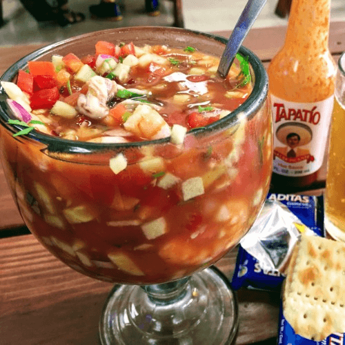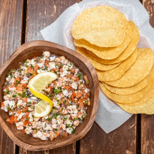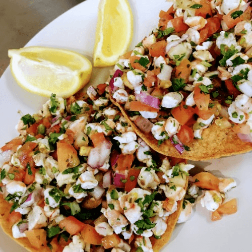 Marinated shrimp in lemon, tossed with diced onions, tomatoes, cilantro, and chile