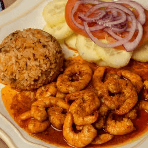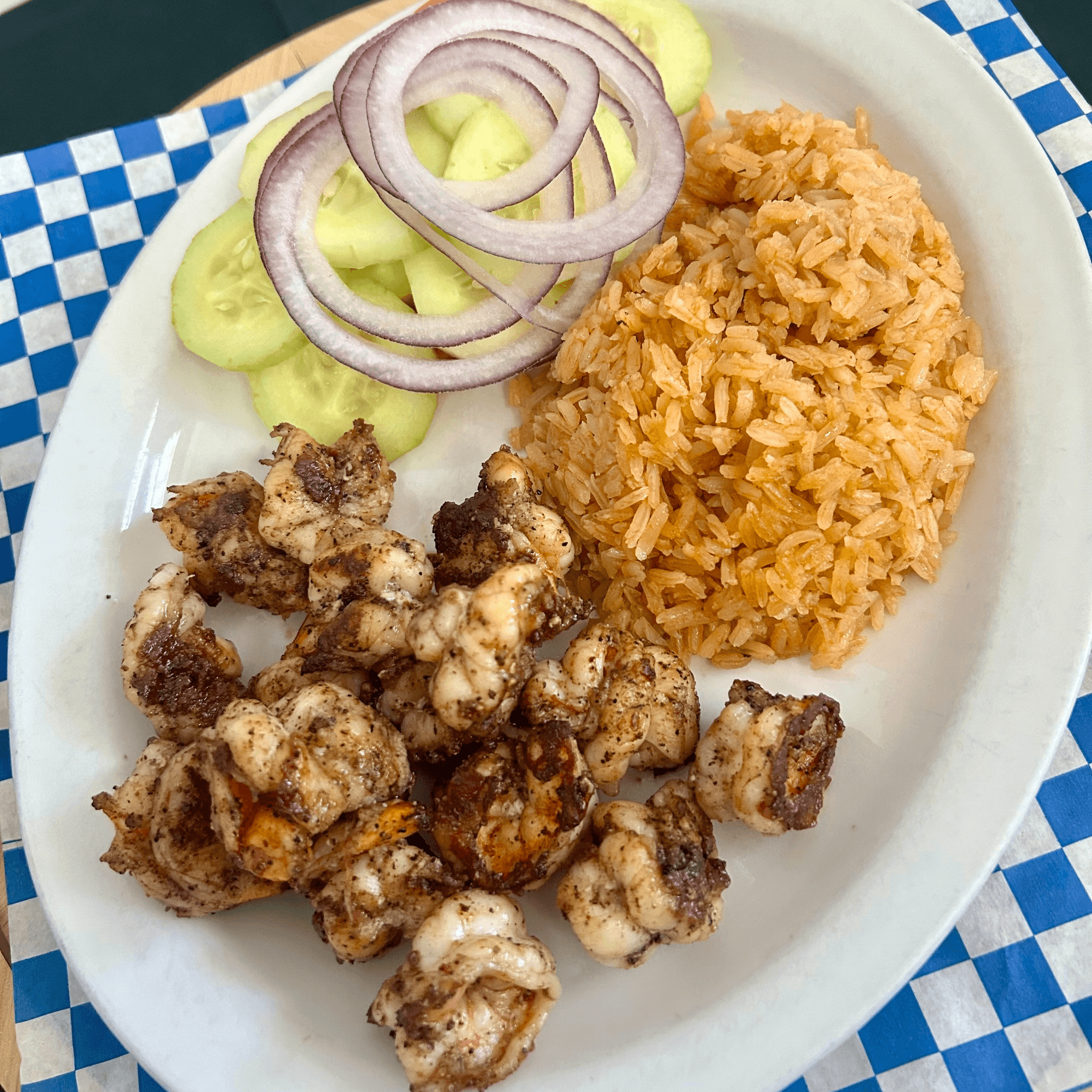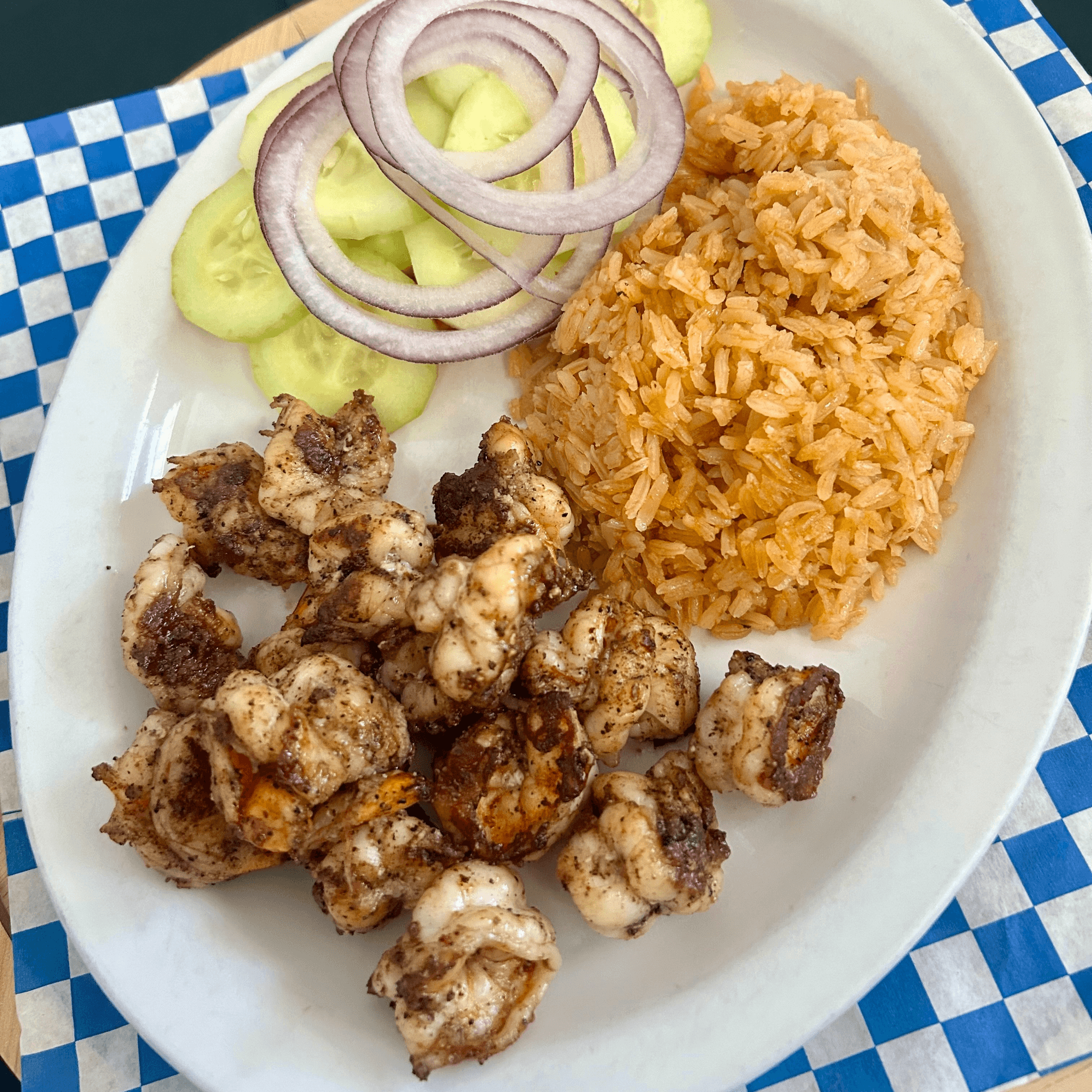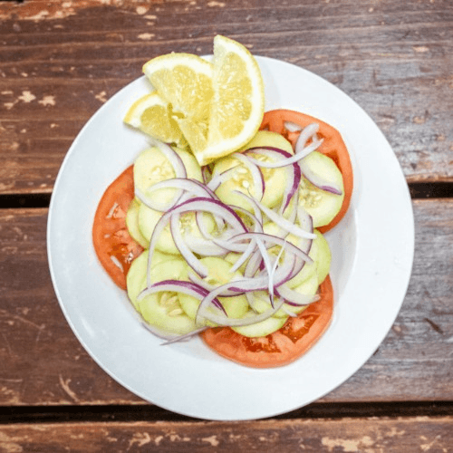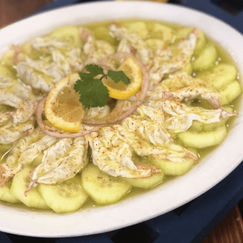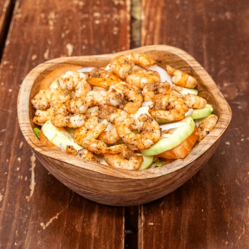 Marinated shrimp in our spicy lemon sauce, laid on a bed of onions and cucumbers