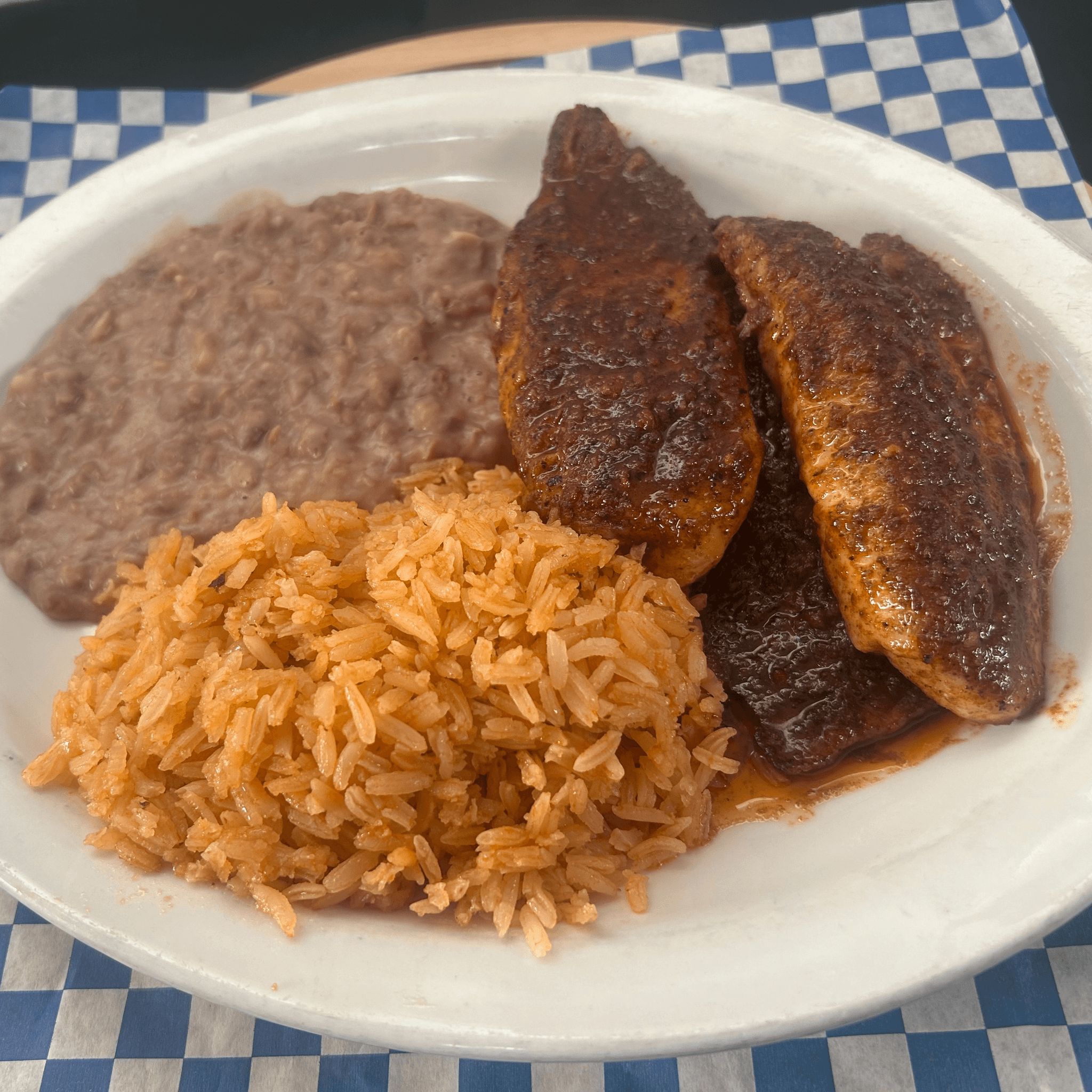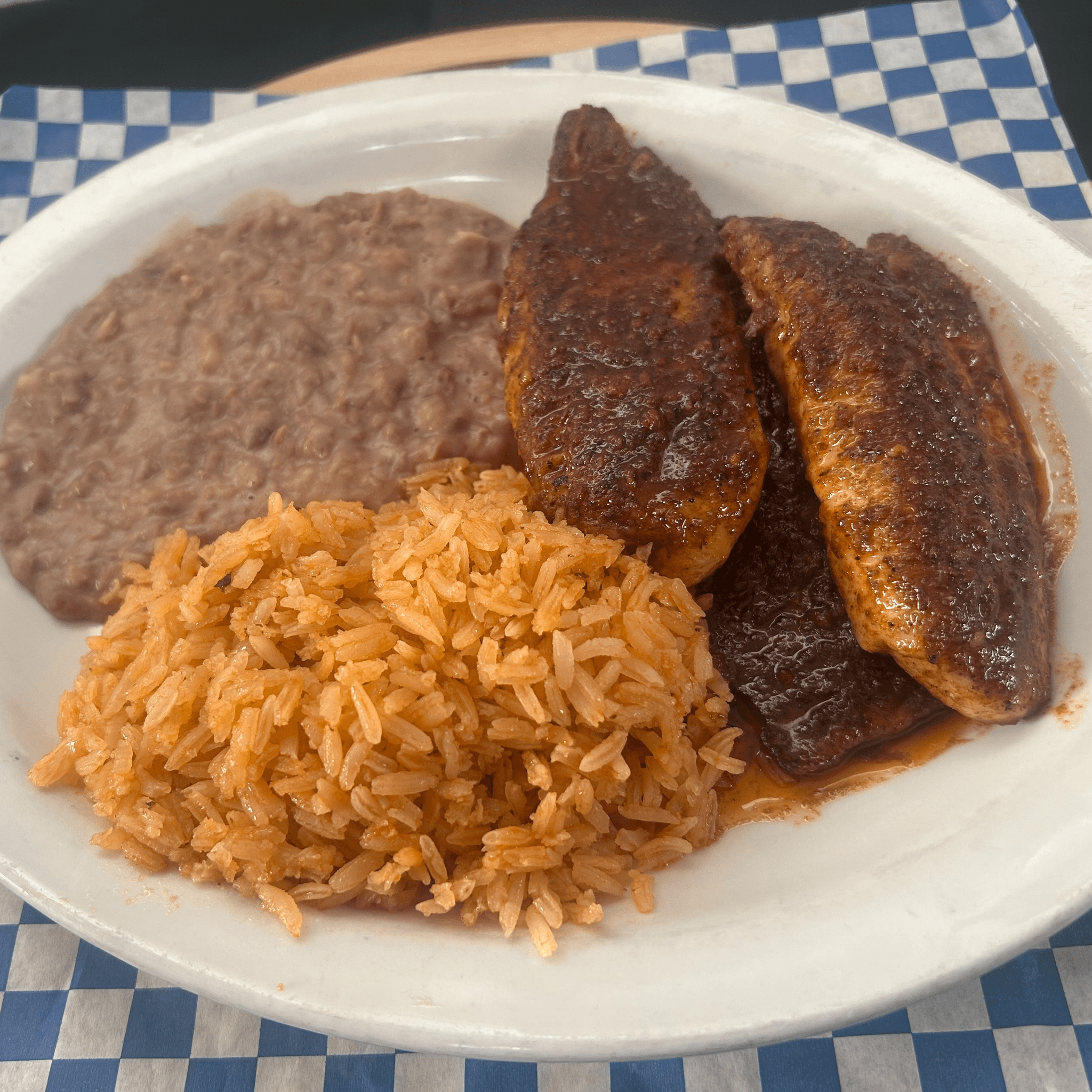 Tilapia fish & shrimp, mix beans, rice, with a freshly made pico de gallo salsa