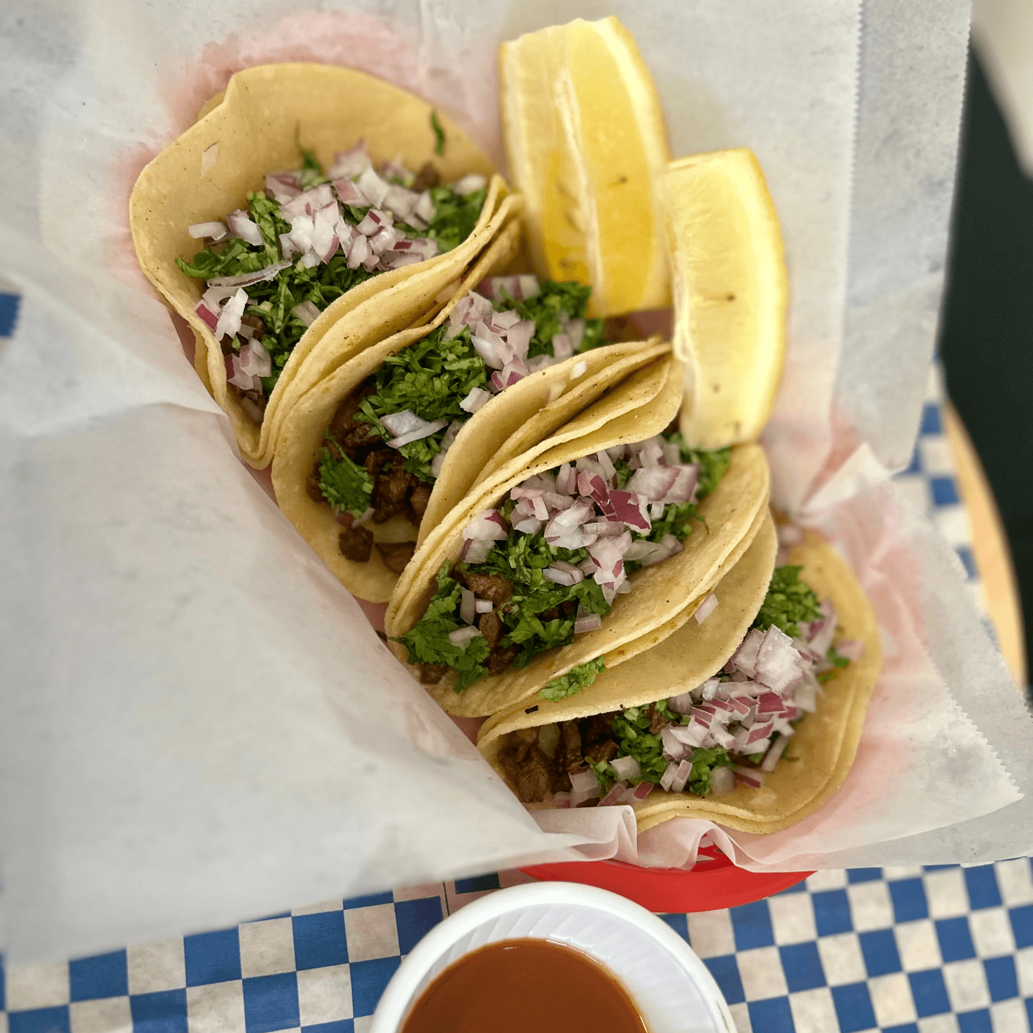 Meat, onions, cilantro, hot sauce