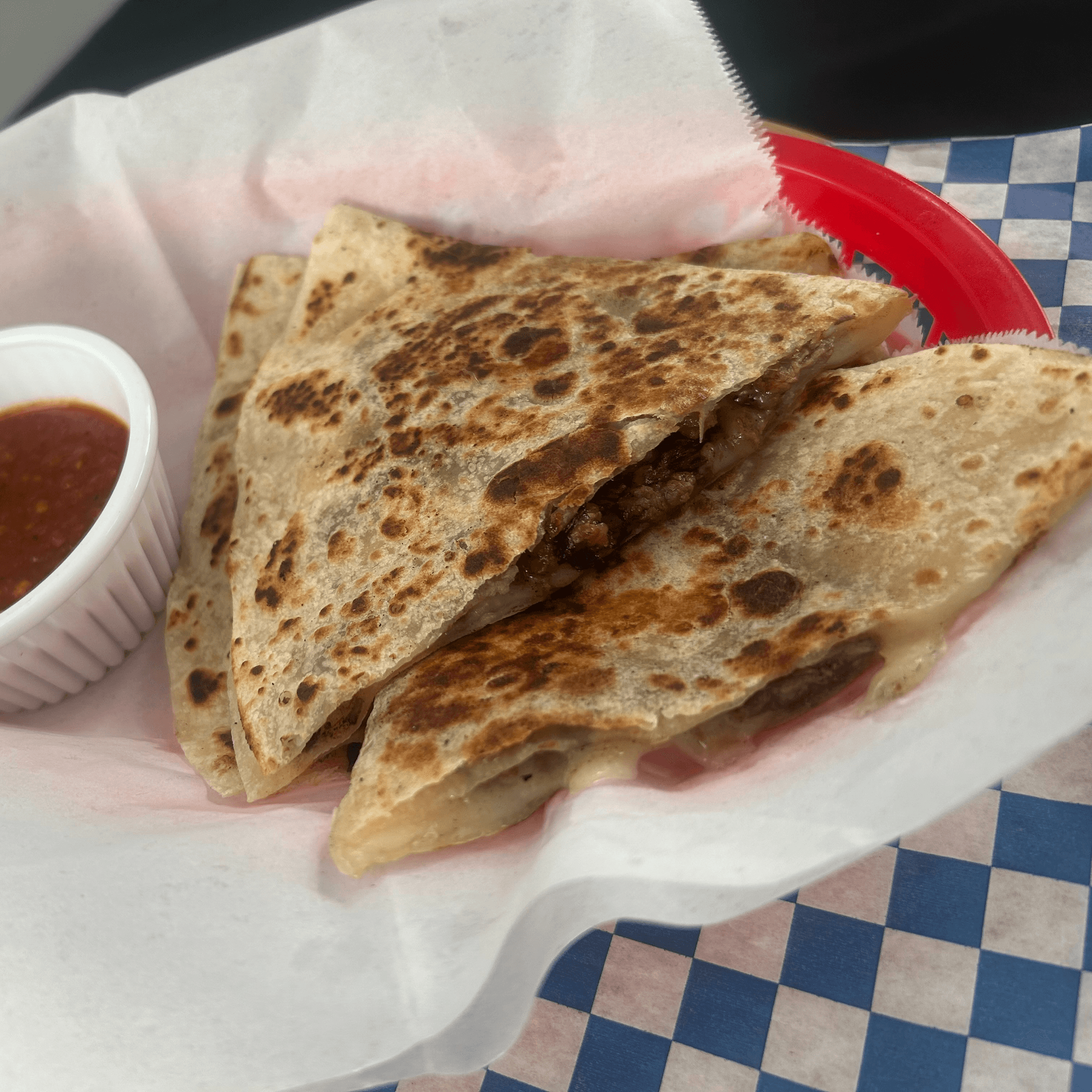 Asada meat and cheese on a flour tortilla and hot sauce