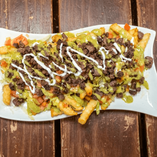 Meat, lettuce, tomatoes, cheese, sour cream, guacamole sauce, fries