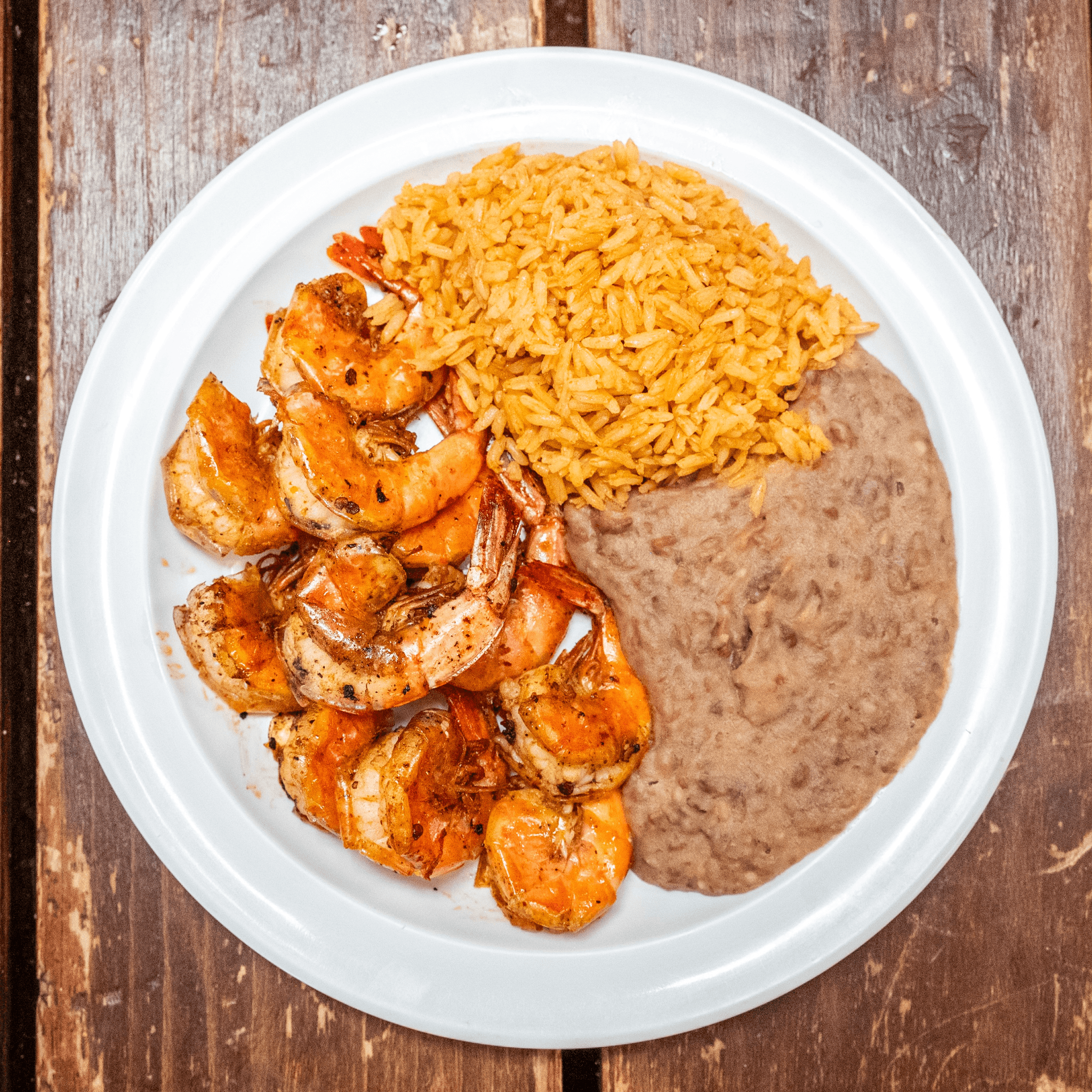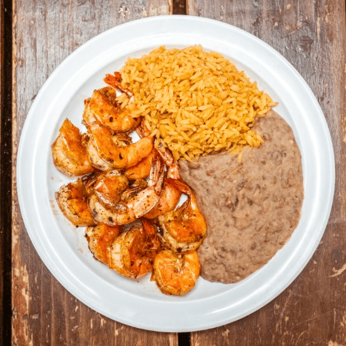 Shrimp, beans, rice, with a freshly made pico de gallo salsa