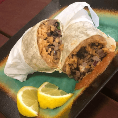 Meat, rice, beans, onion, cilantro, hot sauce