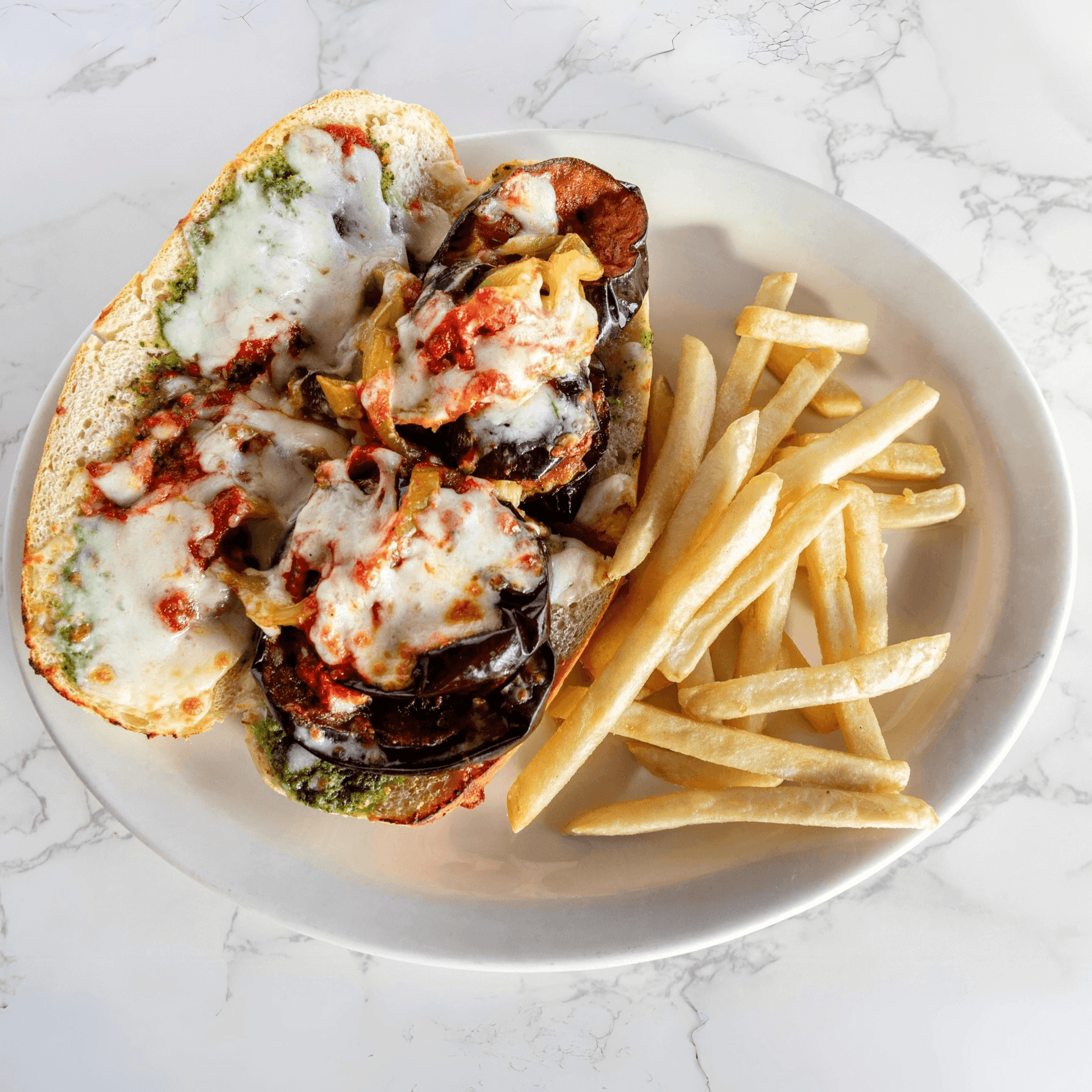 Eggplant with sautéed bell peppers, pesto, red sauce and mozzarella cheese. Served with fries