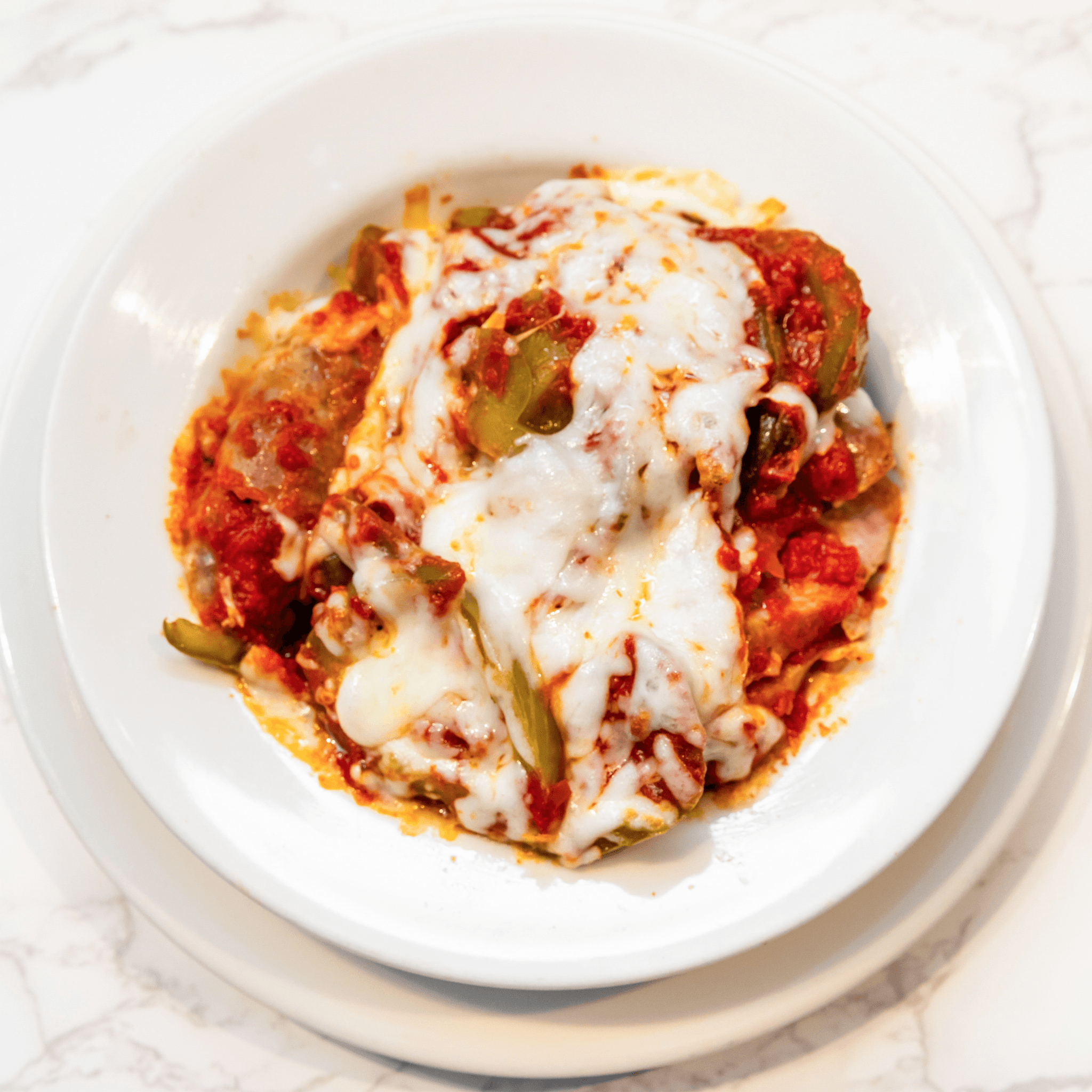 Pieces of chicken breast with green peppers, onions, and mushrooms in a rich wine and red sauce over pasta. Includes homemade bread
