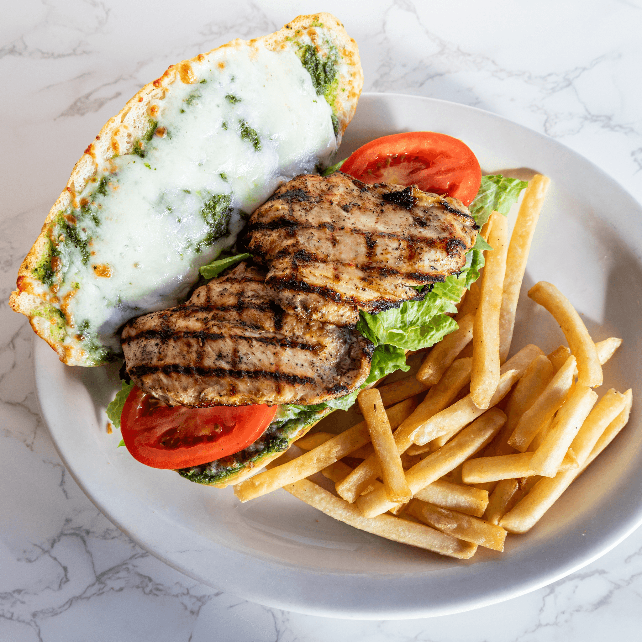 Grilled chicken with pesto, cheese, lettuce, and tomato. Served with fries