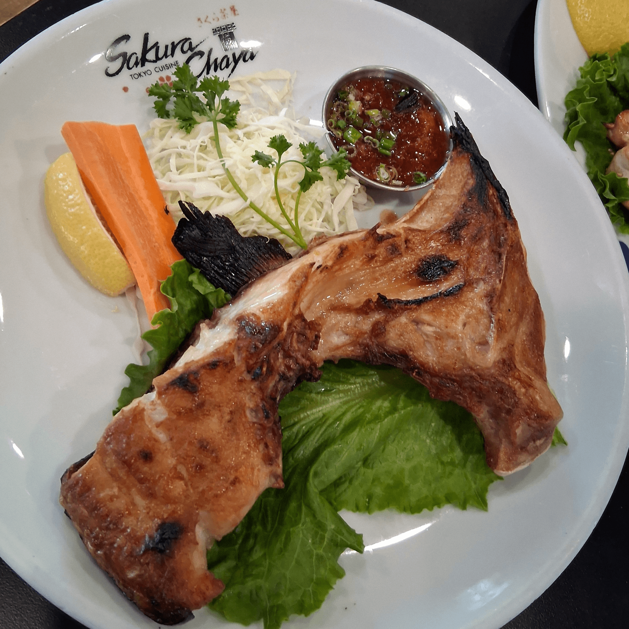 Baked over potato salad. All Sakura Chaya dinners are served with soup, salad, steamed rice, and ice cream, plus a choice of any of these delicious additions: spring roll, shumai, shrimp and vegetable tempura, chicken wings, or sashimi