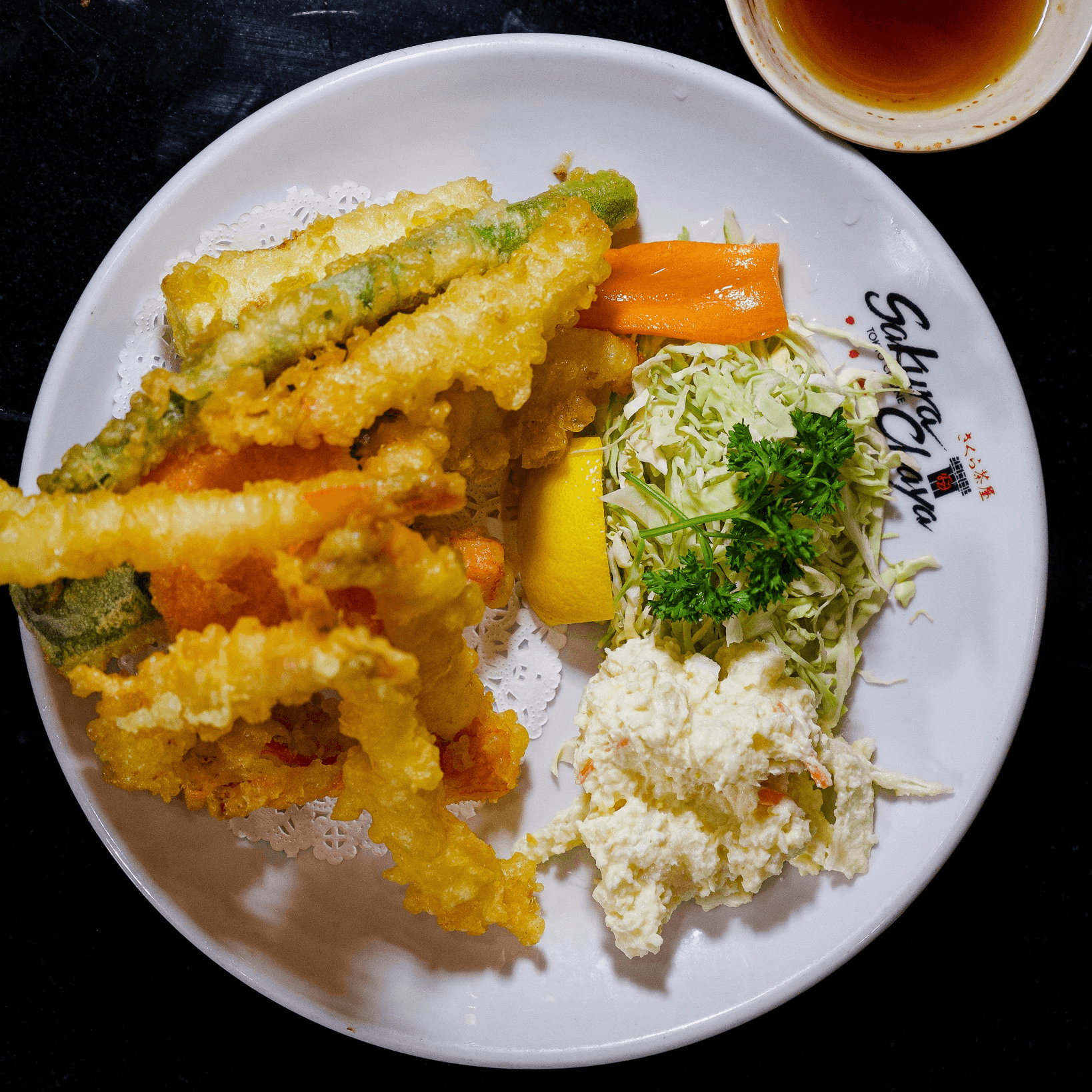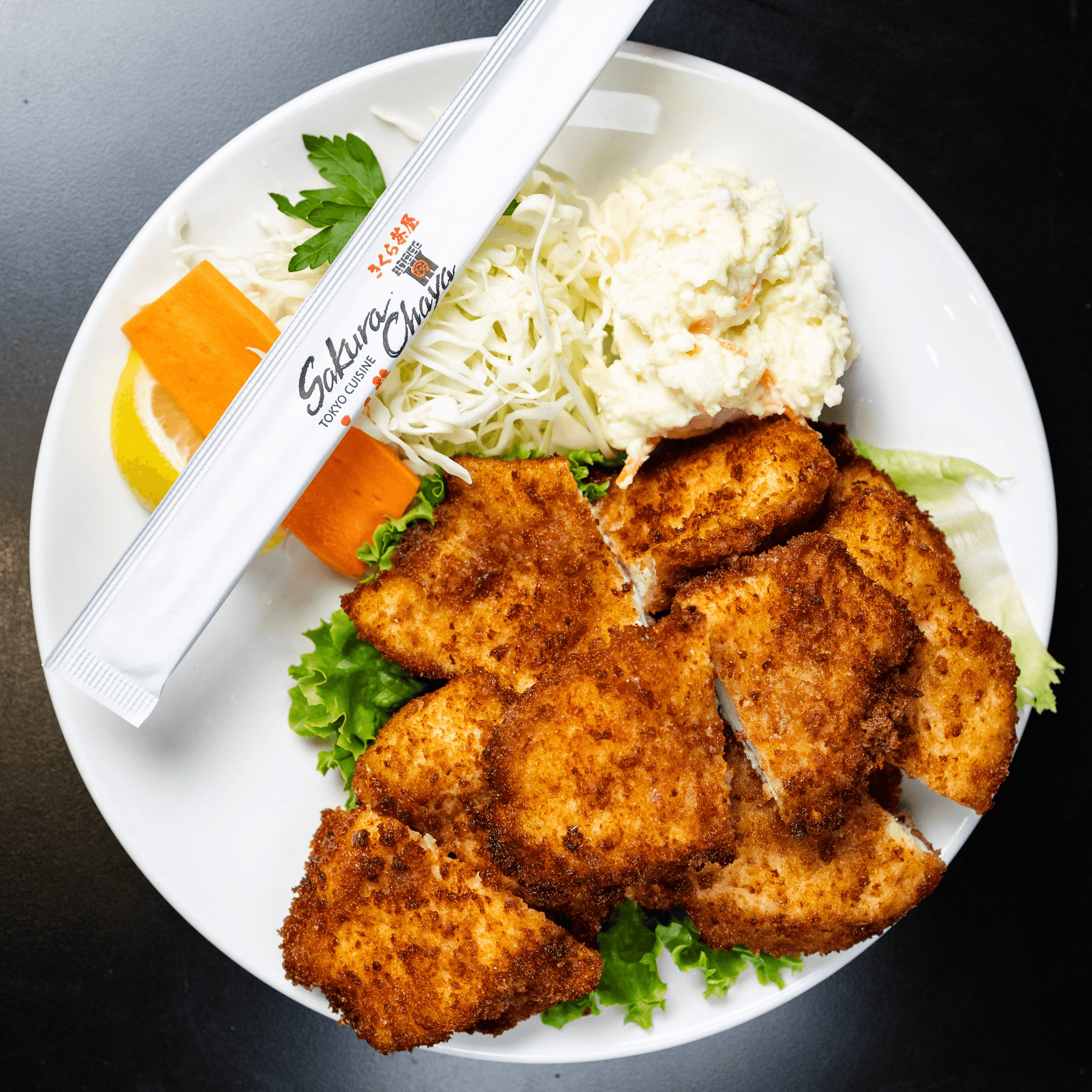 Meat and seafood are prepared and breaded, then fried in pure vegetable oil. All Sakura Chaya dinners are served with soup, salad, steamed rice, and ice cream, plus a choice of any of these delicious additions: spring roll, shumai, shrimp and vegetable tempura, chicken wings, or sashimi