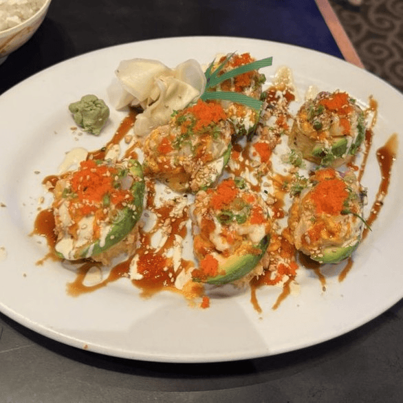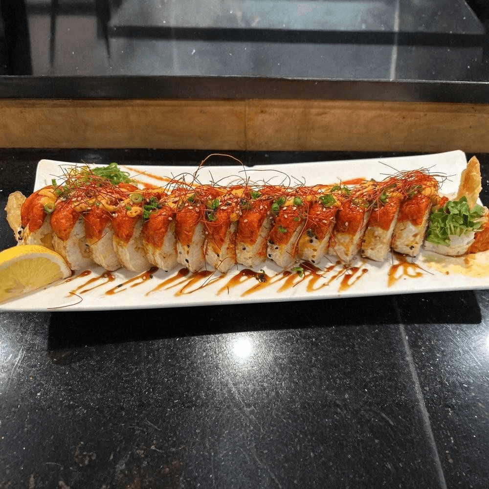 Tempura shrimp, spicy crab, avocado, tuna on top w/ sriracha teriyaki & fish egg, soy wrap.