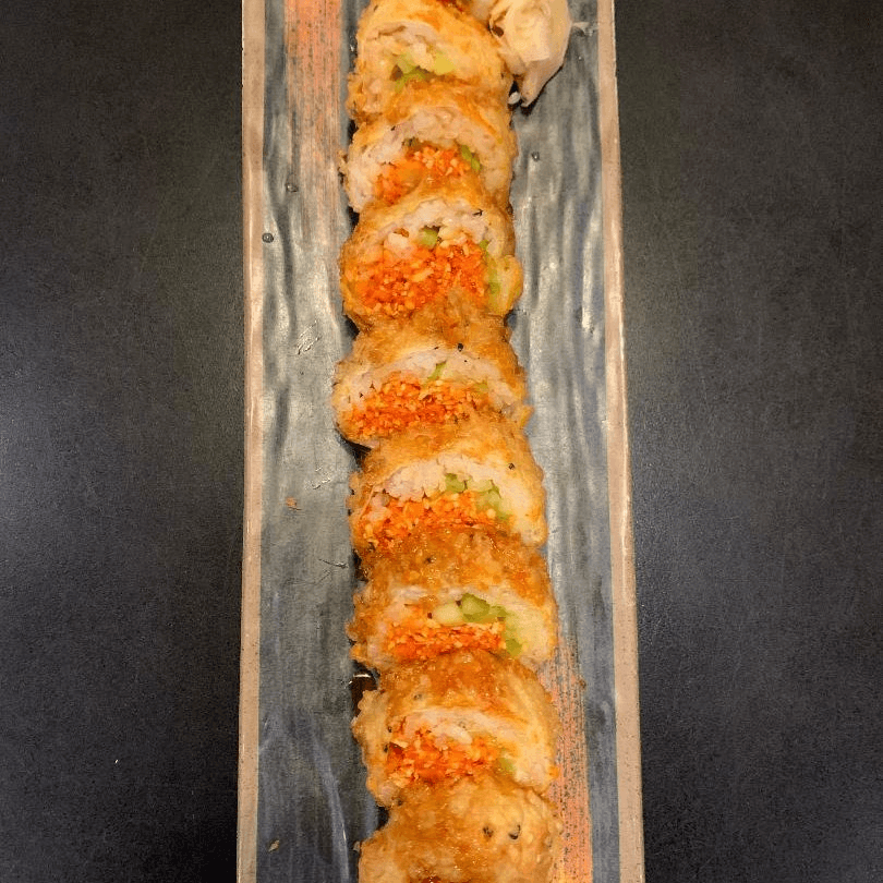 Spicy crab, avocado, tempura shrimp, soy wrap & finished off w/ spicy tuna & fish egg on the top.