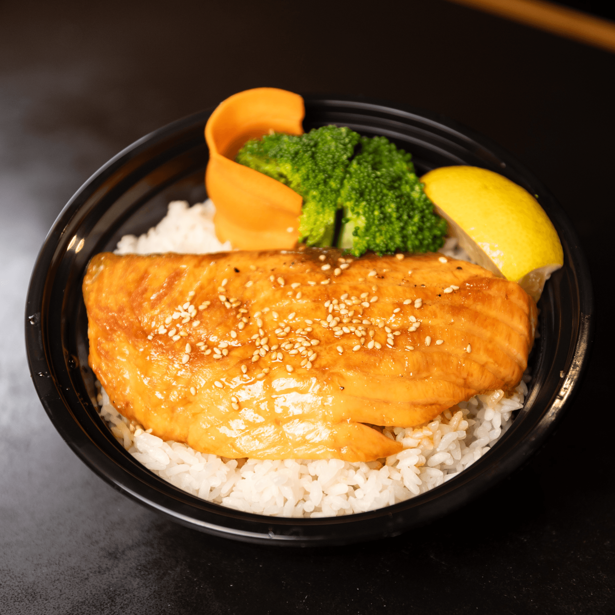 Teriyaki salmon and steamed veggies over steamed rice.