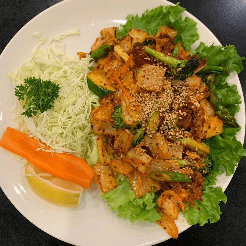 Thinly sliced tender meat or seafood sautéed with ginger sauce and served on a hot plate.