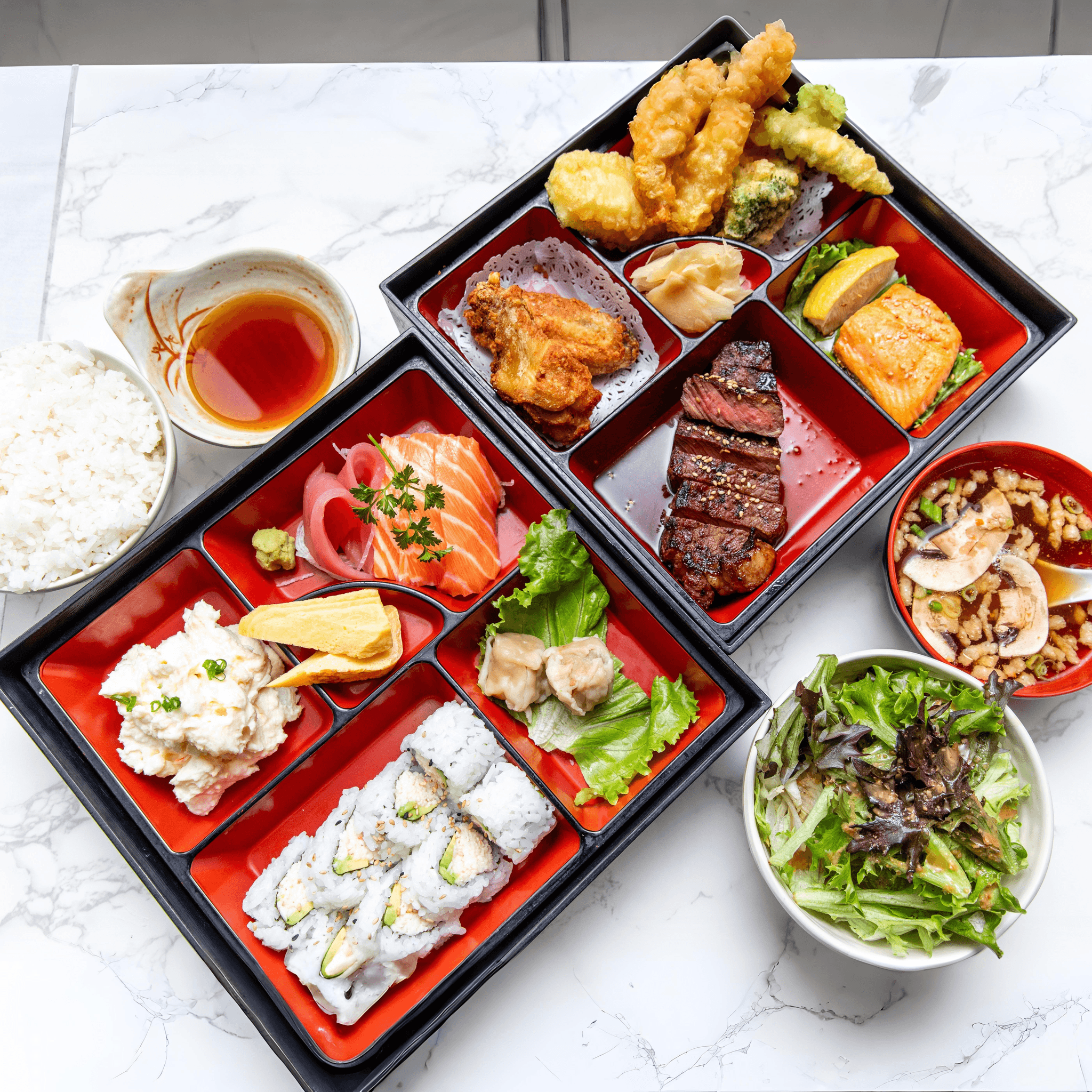 Served with soup, salad, steam rice, shrimp and vegetable tempura, California roll and shumai