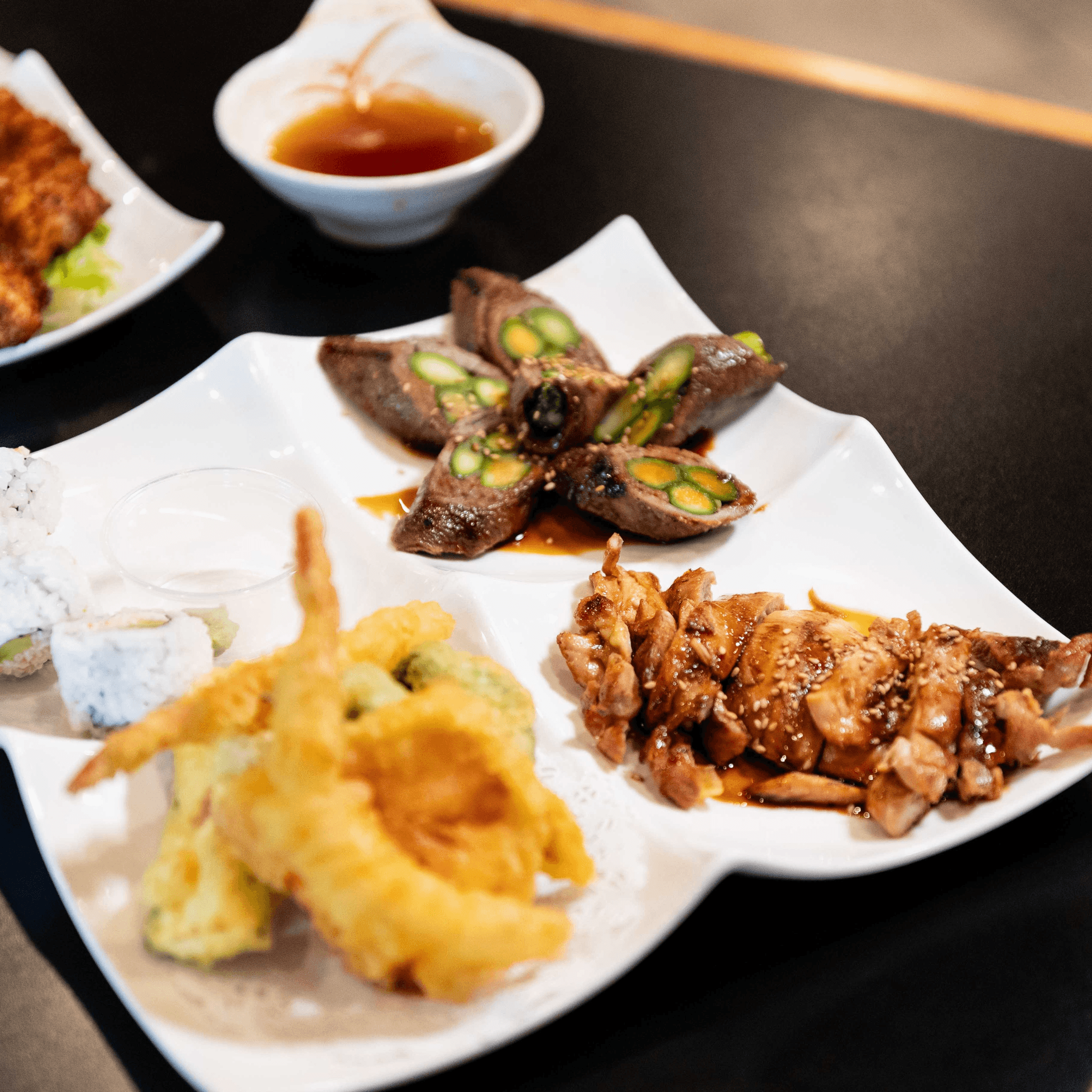 Choose one: shrimp & vegetable tempura, sliced steak or sashimi. Each chaya combination is served with soup, salad, and steamed rice