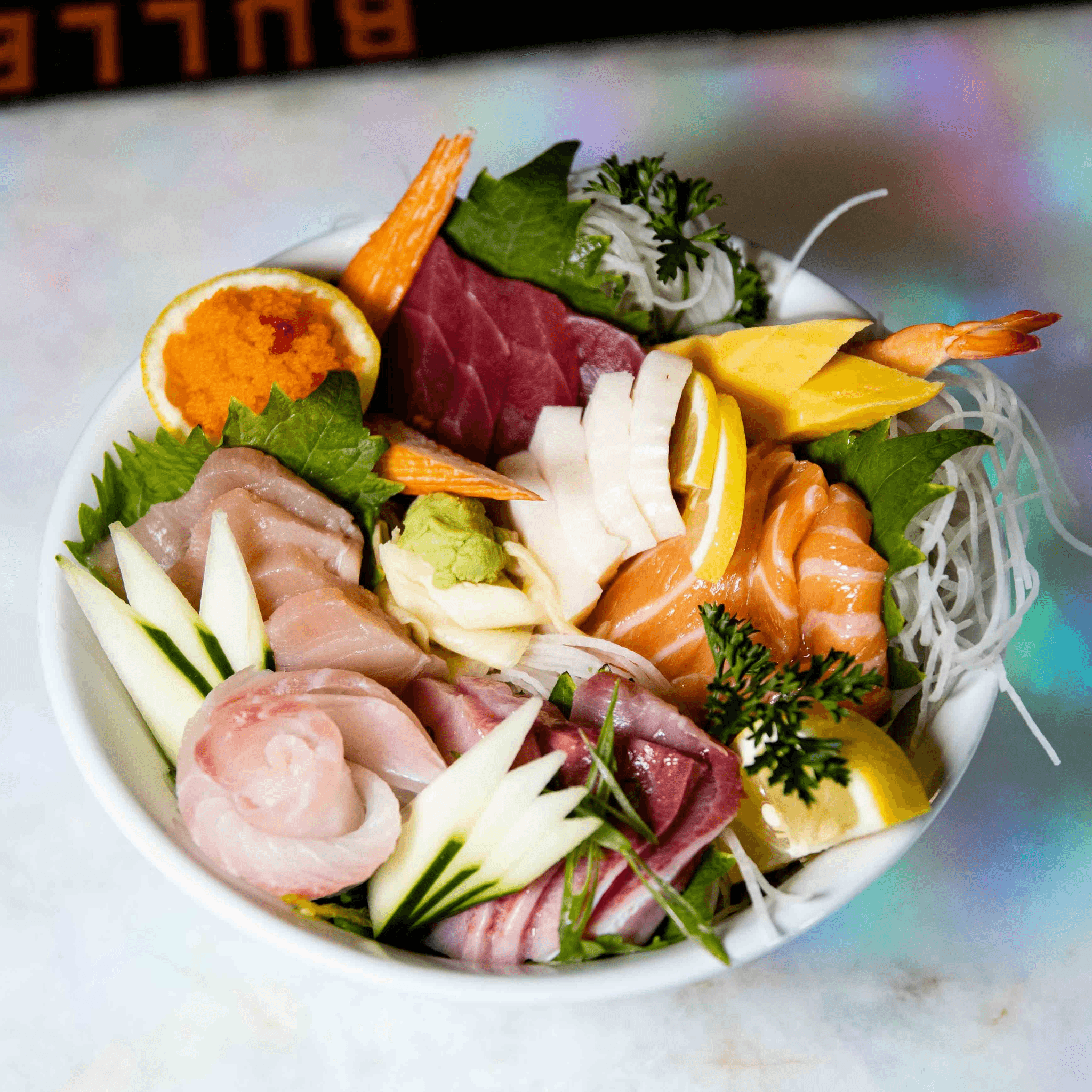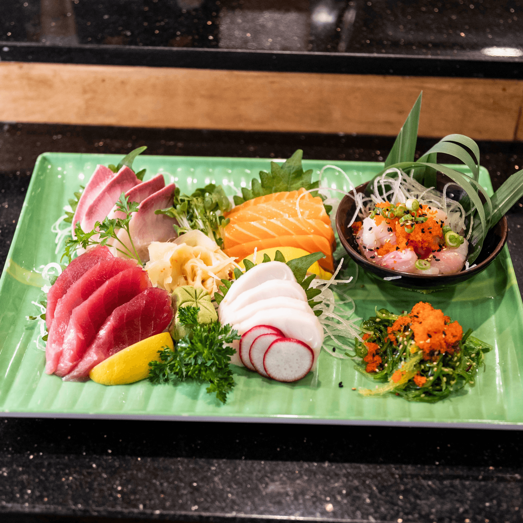 Tempura shrimp, crab mix, avocado, & cucumber seaweed wrapped with tuna, salmon, and yellowtail all on top