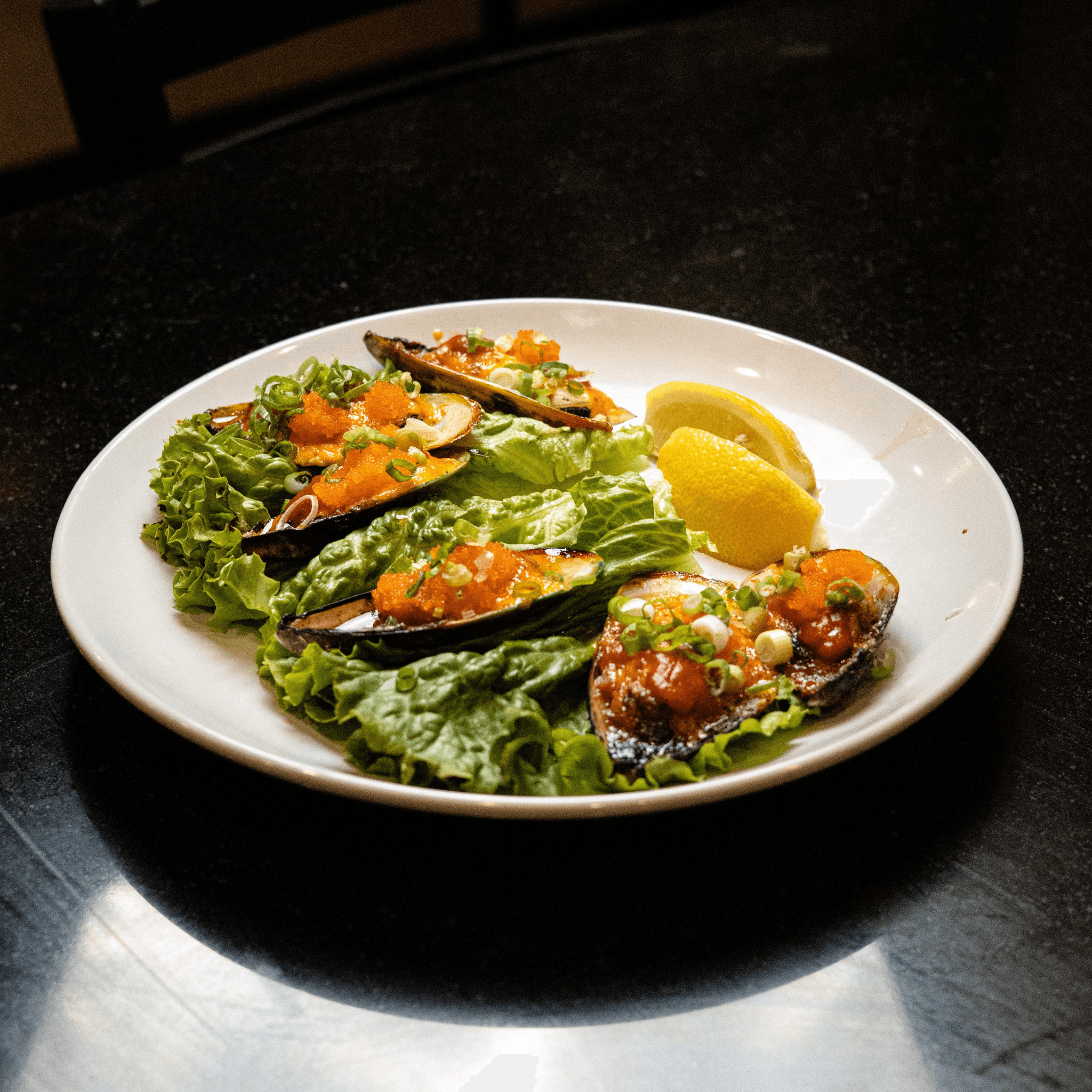 2 deep fried, 2 baked, and 2 raw oysters arranged in harmony w/ various delectable sauces.