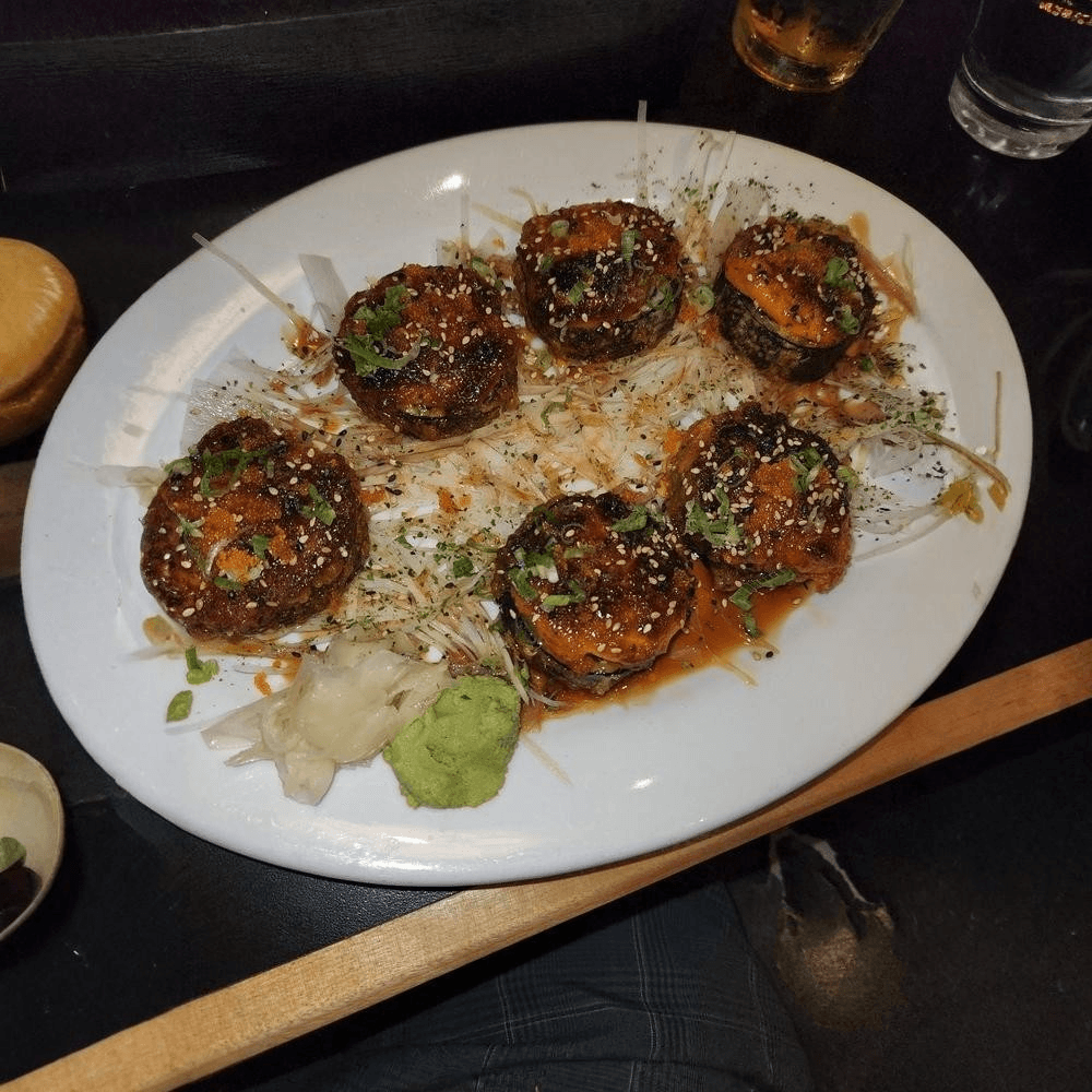 Jumbo soft shell crab & spicy crab w/ avocado, wrapped in soy paper & topped w/ thinly sliced & seared albacore & fish egg, finished w/ spicy ponzu sauce.