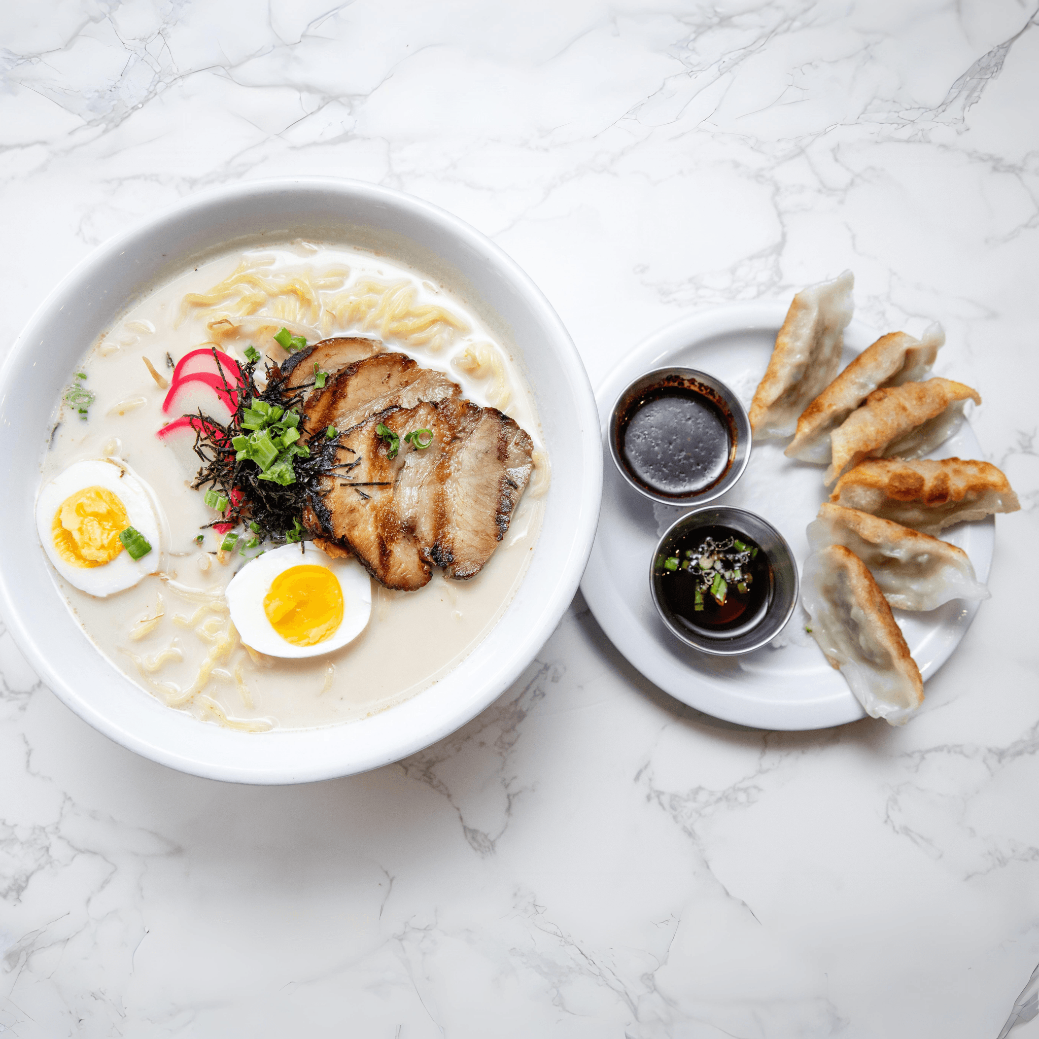 Topped with green onions and served with ponzu & hot sauce