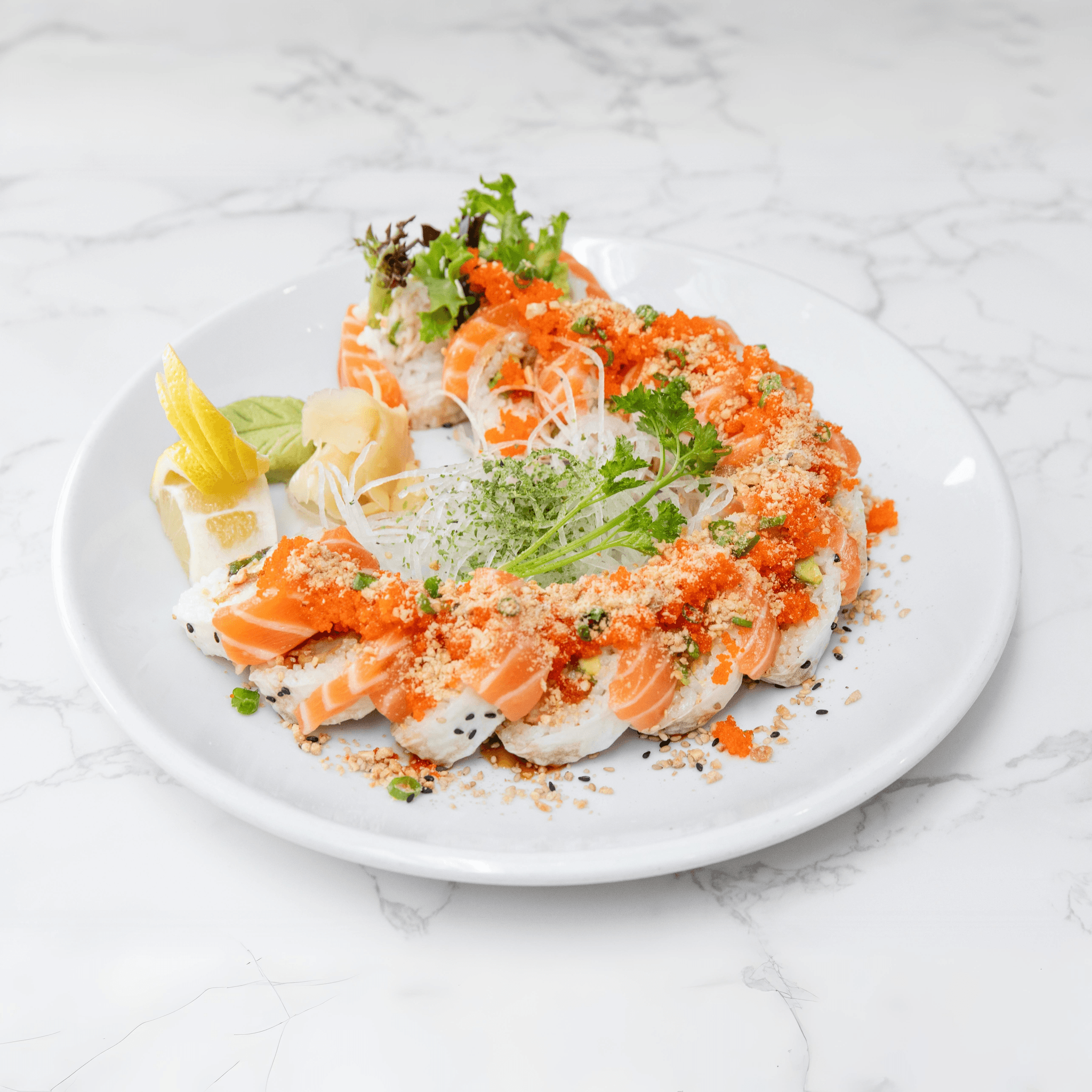 A flowery arrangement of tobiko, avocado, crab mix in a salmon bouquet that will win your heart, soy wrap.