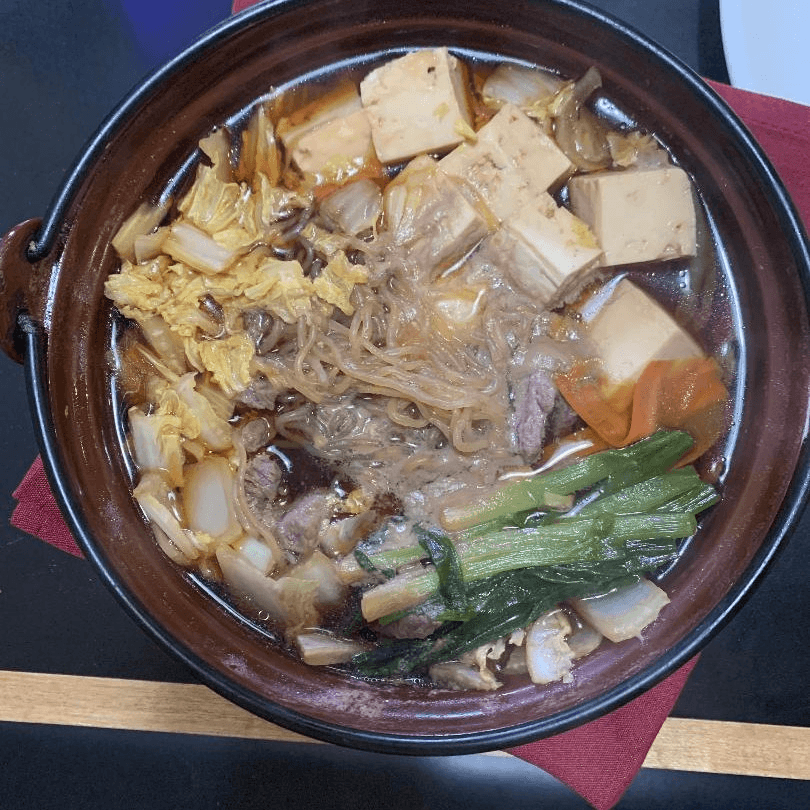 Sliced beef, tofu, vegetables, clear noodles in a sweet beef broth