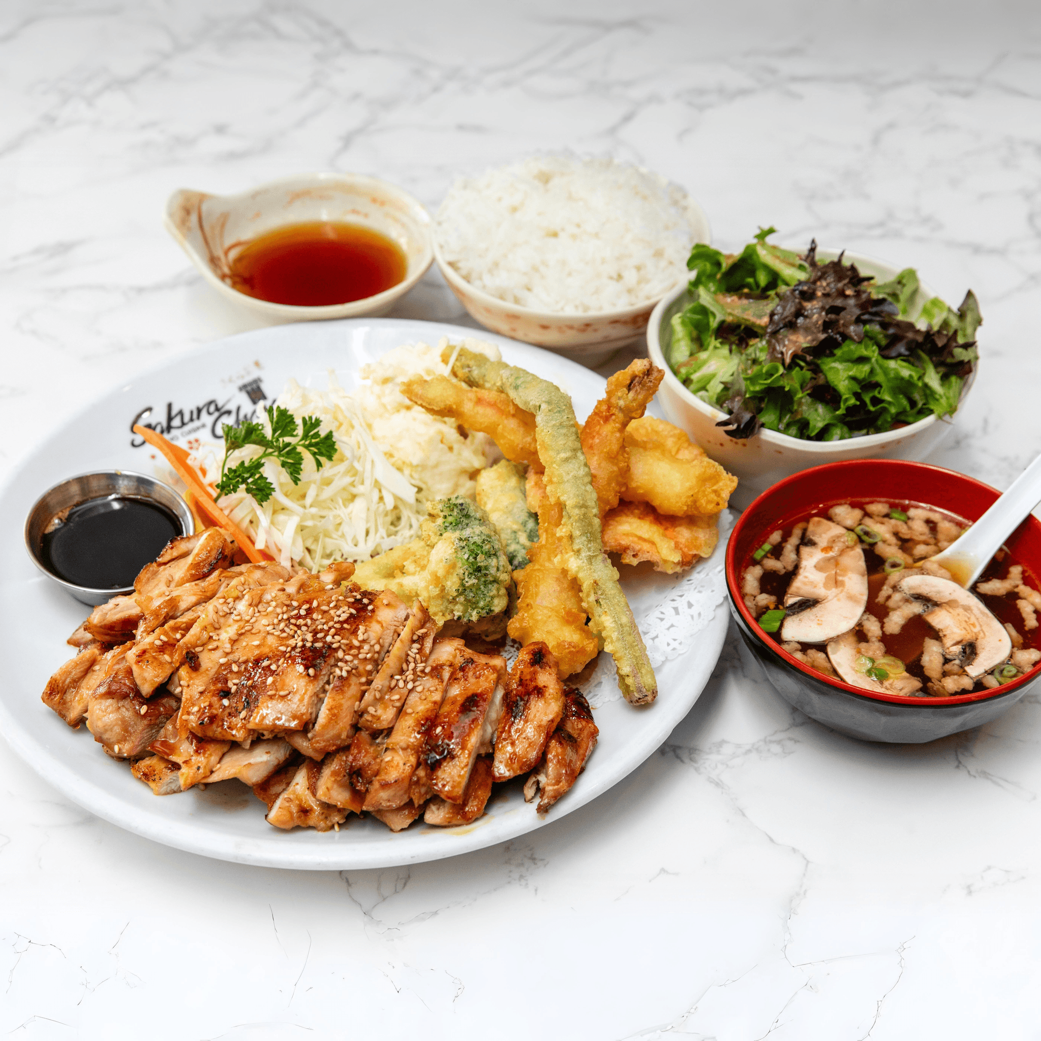 Soup, salad, steamed rice, grilled teriyaki chicken, shrimp and vegetable tempura, California roll, and your choice of one of protein.